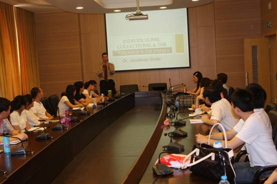 5月22日下午,我校永利集团88304官网主办的“百川讲堂”活动正式在学术会堂603拉开帷幕。第一期由富布莱特访问学者、美国St. Thomas大学哲学系副教授Jonathan Stoltz主讲,主题为”Individualism, Collectivism, and the Prisoner’s Dilemma”,陈文娟副教授担任主持。Stoltz教授从哲学和逻辑学的视角给我校师生带来了一场理性思辨的盛宴。