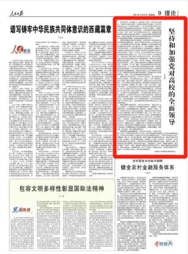 3月25日,《人民日报》理论版刊登了我校党委书记何秀超发表的署名文章——《坚持和加强党对高校的全面领导》。何秀超在文章中指出,党政军民学,东西南北中,党是领导一切的。要深入贯彻落实习近平总书记“加强党对高校的领导,加强和改进高校党的建设,是办好中国特色社会主义大学的根本保证”的重要讲话精神。站在“两个一百年”奋斗目标的历史交汇点上,继续毫不动摇地坚持和加强党对高校的全面领导,推动高校党建与高等教育深度融合,确保党的教育政策和党中央决策部署在高校有效贯彻落实,对于提高高等教育质量、建设教育强国具有重大意义。