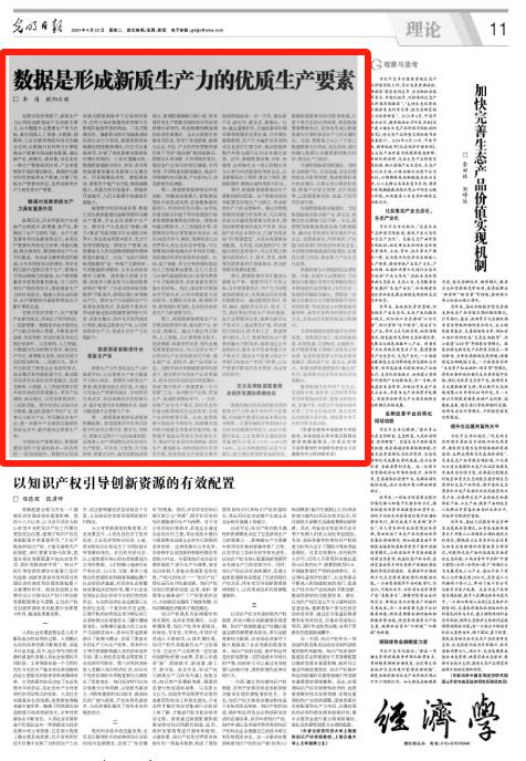 4月23日,《光明日报》(理论版)刊登了我校副校长李涛教授,中国互联网经济研究院副院长欧阳日辉研究员的署名文章《数据是形成新质生产力的优质生产要素》。